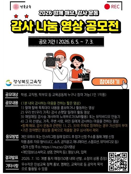 (포탈뉴스통신) 경북교육청은 학생과 학부모, 교직원 등 교육공동체가 함께 감사의 마음을 나누는 문화를 확산하기 위해 ‘감사 나눔 영상 공모전’을 개최한다고 24일 밝혔다.