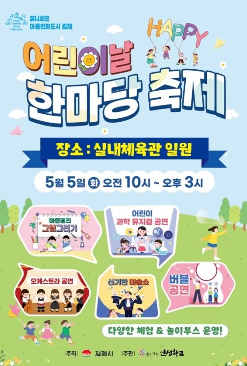(포탈뉴스통신) 김제시(시장 정성주)는 제104회 어린이날을 맞아, 오는 5월 5일(화) 실내체육관 주차장 일원에서 어린이날 한마당 축제를 개최한다고 밝혔다.