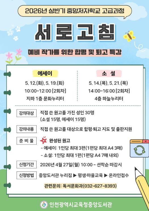(포탈뉴스통신) 인천광역시교육청중앙도서관은 4월 27일부터 예비 작가를 위한 ‘중앙저자학교 고급과정’ 참여자를 모집한다.