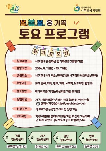 (포탈뉴스통신) 인천서부교육지원청은 4월 11일부터 10월 17일까지 ‘2026 서부 방과후·돌봄 지역연계(봄봄봄) 온 가족 토요 프로그램’을 운영한다.