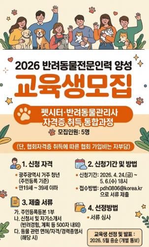 (포탈뉴스통신) 광주광역시는 반려동물 산업 성장에 대응하고 전문역량을 갖춘 인재 양성을 위한 ‘2026년 반려동물 전문인력 양성교육’을 실시한다.
