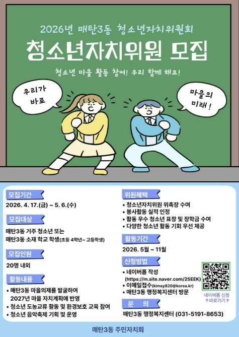 (포탈뉴스통신) 수원시 영통구 매탄3동은 매탄3동 주민자치회가 지역 청소년의 참여를 확대하고, 향후 지역사회를 이끌어 나갈 역량을 기르기 위해 2026년 청소년자치위원회 위원을 모집한다고 밝혔다.