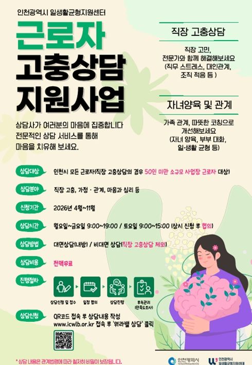 한편 '근로자 고충상담 지원사업'은 인천 관내 근로자를 대상으로 진행되며, 특히 '직장고충' 상담의 경우 50인 미만 소규모 사업장 근로자 대상으로 운영한다. 상담 신청 및 자세한 사항은 인천 일생활균형지원센터 홈페이지에서 확인할 수 있다.
