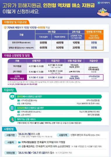 이와 함께 지역 간 지원 격차를 보완하기 위한 ‘인천형 역차별 해소 지원금’ 5만 원도 5월 11일부터 취약계층을 대상으로 추가 지급될 예정이다.