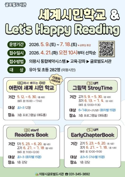 (포탈뉴스통신) 의왕시 글로벌도서관이 책을 통해 세상을 이해하고 체험하는 다문화 이해 프로그램 '어린이 세계 시민 학교'와 영어 읽기 문해력 향상을 위한 단계별 맞춤 프로그램 'Let’s Happy Reading'의 참여자를 모집한다.
