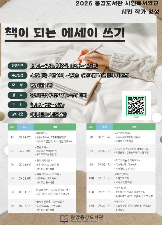 (포탈뉴스통신) 광양용강도서관은 ‘문학책의 해’를 맞아 시민의 글쓰기 역량을 높이기 위해 ‘책이 되는 에세이 쓰기’ 프로그램 수강생을 모집한다고 밝혔다.