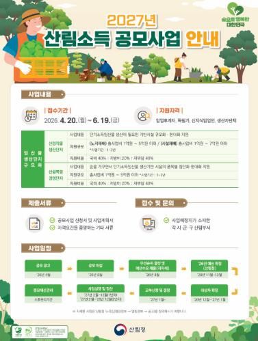 (포탈뉴스통신) 고흥군은 임산물 생산 기반 확충과 임업 경쟁력 강화를 위해 ‘2027년도 산림소득사업(임산물생산단지 규모화)’ 공모사업 신청을 오는 6월 19일까지 접수한다고 밝혔다.