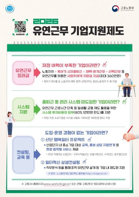 다만, 중소기업의 경우 인력 운영 부담, 시스템 구축 비용, 보안 문제 등으로 유연근무 도입과 활용에 어려움이 있는 것도 현실이다. 이에 정부는 기업 여건에 맞는 맞춤형 지원을 통해 민간 확산을 적극 뒷받침하고 있다.