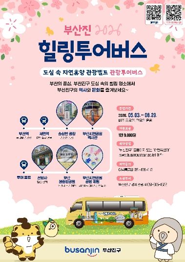 (포탈뉴스통신) 부산진구는 도심 속 자연휴양 관광벨트 사업의 일환으로 부산진구의 주요 관광지와 자연휴양 자원을 연계한 ‘부산진 힐링투어버스’를 5월부터 9월 말까지 운영한다고 밝혔다.
