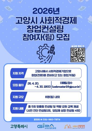 (포탈뉴스통신) 고양산업진흥원이 운영하는 고양시사회적경제지원센터가‘2026년 고양시 사회적경제 창업컨설팅 사업’에 참여할 예비 창업자(팀)을 오는 30일까지 모집한다.