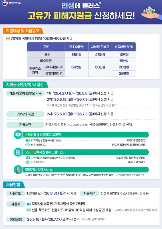 취약계층을 대상으로 하는 1차 신청은 4월 27일부터 5월 8일까지이며, 소득 하위 70% 일반 가구를 대상으로 하는 2차 신청은 5월 18일부터 7월 3일까지 진행된다.
