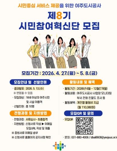 (포탈뉴스통신) 여주도시공사는 여주시민 및 이용 고객들의 다양한 의견을 수렴하고, 함께 문제를 해결하는 시민참여형 활동의 일환인 ‘시민참여혁신단 8기’를 모집한다고 밝혔다.