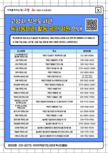 고양시 관계자는 “이번 공간 지원 사업이 독서동아리의 활동 기반을 넓히고, 작은도서관이 지역사회 내 커뮤니티 공간으로서 기능을 강화하는 계기가 되길 바란다”며, “앞으로도 시민들이 ‘함께 읽는 독서 문화’를 누릴 수 있도록 지원하겠다”고 말했다.