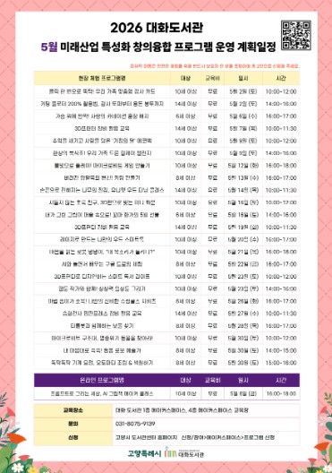(포탈뉴스통신) 고양특례시 대화도서관은 가정의 달을 맞아 오는 5월 ‘미래산업 특성화 창의융합 프로그램’을 운영한다고 24일 밝혔다.
