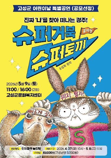 (포탈뉴스통신) 평화 경제 거점 도시 강원 고성군은 어린이날을 기념하여 온 가족이 함께 즐길 수 있는 가족 뮤지컬 '슈퍼거북 슈퍼토끼'를 오는 5월 9일 고성군 문화복지센터에서 개최한다.