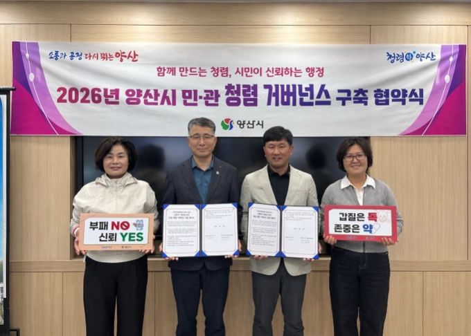 (포탈뉴스통신) 양산시 안전도시국이 청렴 시책의 실효성을 높이고 민·관 협력체계를 공고히 하기 위해 양산소방서 의용소방대연합회와 ‘민·관 청렴 거버넌스’ 업무협약을 체결했다고 밝혔다.