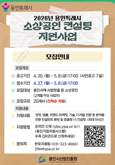 (포탈뉴스통신) 용인특례시와 용인시산업진흥원은 ‘2026년 용인시 소상공인 창업 및 경영 컨설팅 지원사업’에 참여할 소상공인을 모집한다고 26일 밝혔다.