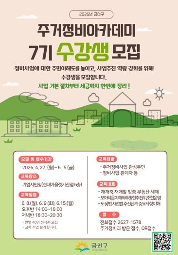 수강 신청은 오는 27일부터 6월 5일까지 가능하다. 전화 신청 또는 QR코드를 통한 온라인 접수와 금천구 주거정비과 방문 신청하면 된다.
