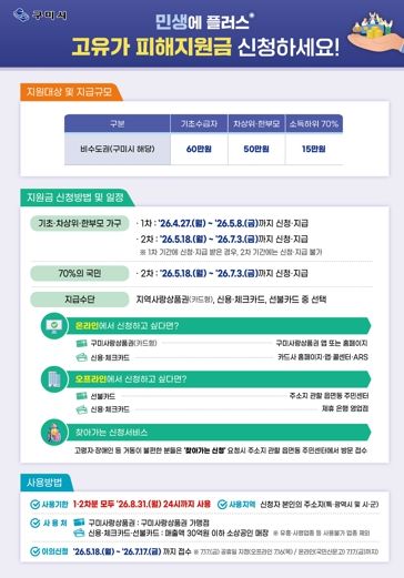(포탈뉴스통신) 구미시는 고유가와 물가 상승으로 인한 시민들의 경제적 부담을 완화하기 위해 '고유가 피해지원금' 1차 신청·접수를 4월27일부터 시행한다.