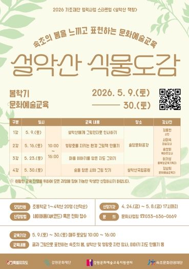 ‘설악산 식물도감’은 초등학생 1~4학년을 대상으로 봄학기와 가을학기로 나눠 운영한다. 봄학기는 5월 9일부터 30일까지 총 4회 진행되며, 설악산과 영랑호 일대 자연 탐사를 통해 계절의 변화를 관찰하고 이를 글과 그림으로 표현하는 창작 활동으로 꾸며진다. 주요 프로그램은 ‘설악산에게 그림편지로 인사하기’, ‘숲을 담은 시와 그림 짓기’ 등이며, 지역에서 활발히 활동하는 전문 강사들이 교육에 참여한다.