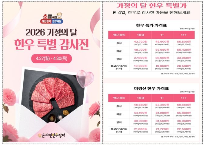 (포탈뉴스통신) 농림축산식품부는 가정의 달을 맞아 한우자조금, 전국한우협회, 농협경제지주와 협력하여 4월 27일부터 5월 10일까지 14일 동안 농축협 하나로마트, 대형마트 및 주요 온라인몰 등에서 ‘소(牛)프라이즈 대한민국 한우고기 할인행사’를 실시한다고 밝혔다.