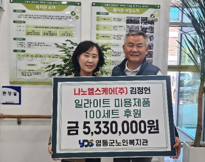 (포탈뉴스통신) 경북 구미시 소재 나노헬스케어(주) 김정헌 대표는 27일 영동군노인복지관을 찾아 일라이트 비누 등 미용제품 533만 원 상당을 기탁했다.