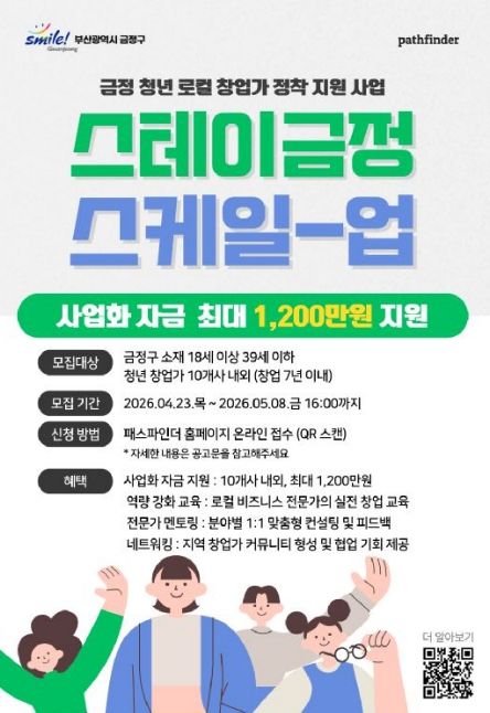 (포탈뉴스통신) 부산 금정구는 청년 창업가의 지역 기반 창업과 로컬 비즈니스 활성화를 위해 ‘2026 금정 청년 로컬 창업가 정착 지원사업(스테이 금정 Scale-up)’ 참여 기업을 모집한다.