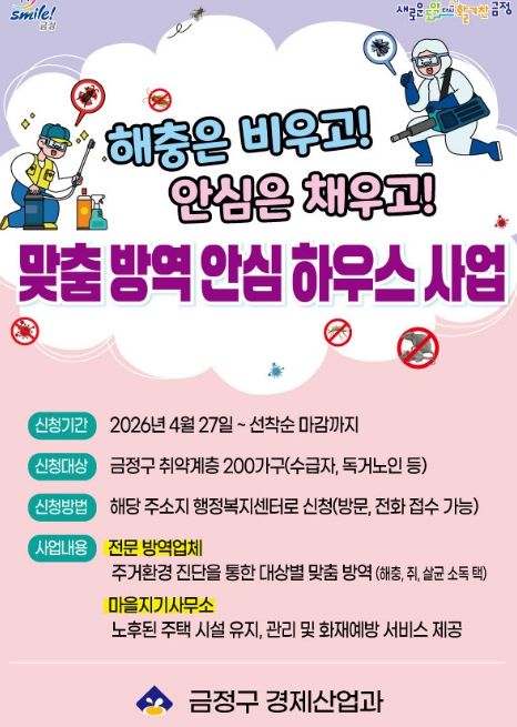 ‘맞춤 방역 안심하우스’는 단순 방역을 넘어 가구별 여건을 반영한 맞춤형 지원이 특징이다. 대상 가구의 주거 환경을 사전 진단한 뒤 ▲해충(바퀴벌레 등) ▲쥐 방역 ▲살균 방역 중 필요한 서비스를 제공하며, 필요시 노후 주택의 소규모 유지·관리와 화재 예방 물품도 함께 지원한다.