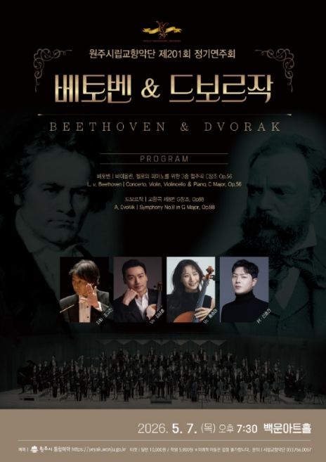 (포탈뉴스통신) 원주시립교향악단 제201회 정기연주회가 오는 5월 7일 오후 7시 30분 백운아트홀에서 개최된다. 이번 연주회에는 지휘자 조규진과 바이올리니스트 김남훈, 첼리스트 홍승아, 피아니스트 신효건이 협연자로 나서 베토벤 3중 협주곡 C장조와 드보르작 교향곡 제8번 G장조를 선보일 예정이다.
