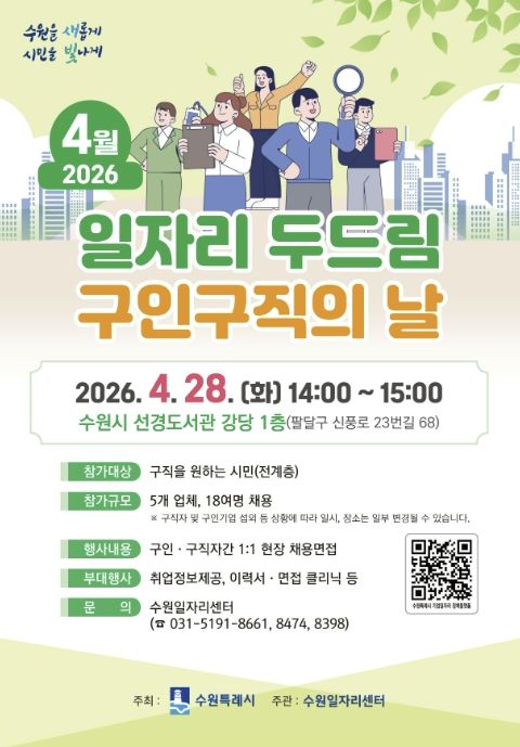 (포탈뉴스통신) 수원특례시는 4월 28일 오후 2시부터 3시까지 선경도서관 강당에서 ‘4월 일자리 두드림 구인·구직의 날’을 개최한다.