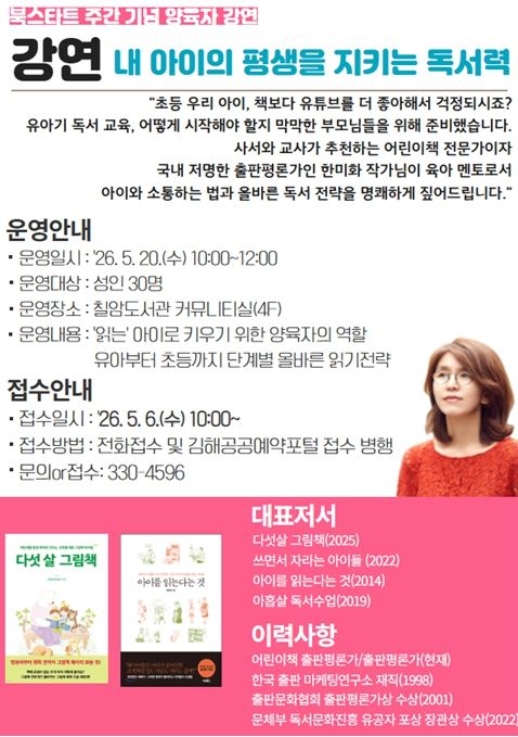 이순주 관장은 “국내 여러 분야에서 활발히 활동하고 있는 전문 강사의 강연을 통해 부모가 자녀와 책으로 소통하고 긍정적인 관계를 형성하는 계기가 될 것으로 기대한다”고 말했다.