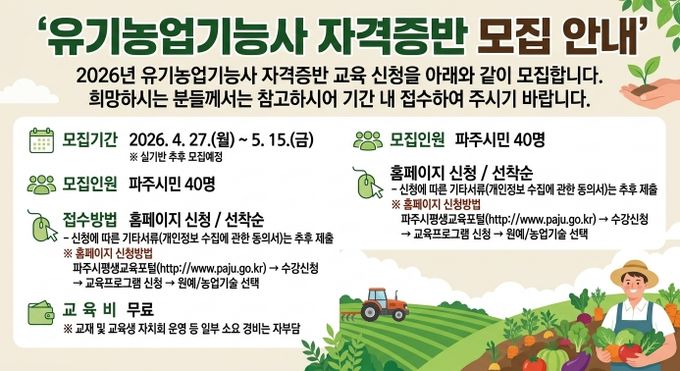(포탈뉴스통신) 파주시농업기술센터는 친환경농업 분야 농업 전문 인력 육성을 위한 '2026년 유기농업기능사 자격증 취득’교육생을 4월 27일부터 5월 15일까지 모집한다.
