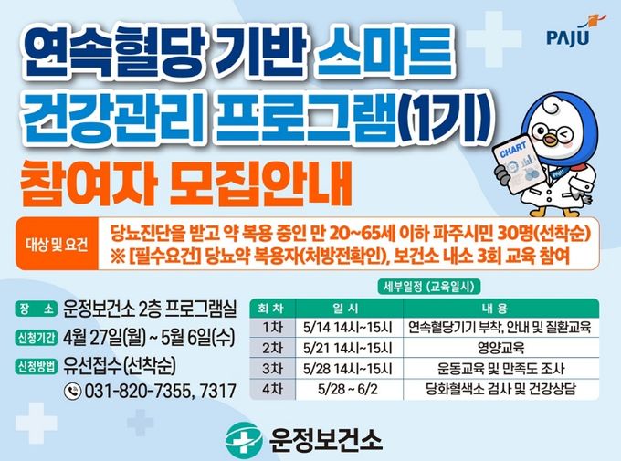 (포탈뉴스통신) 파주시 운정보건소는 심뇌혈관질환 예방관리사업의 일환으로 ‘연속혈당 기반 스마트 건강관리 프로그램’참여자를 오는 27일부터 10일간 모집한다.