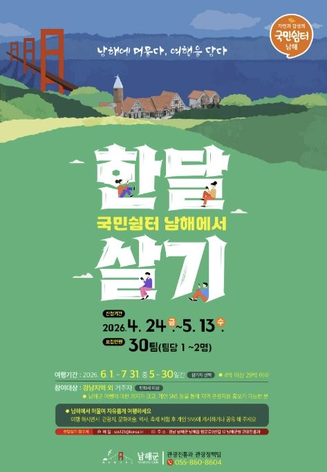 남해군 ‘국민쉼터 남해에서 한 달 살기’는 경남 이외에 거주하는 만19세 이상 국민이면 누구나 참여 가능하며, 자세한 사항은 남해군 홈페이지 공고에서 확인할 수 있다. 남해군 관광진흥과장은 “2026년은 남해군이 체류형 관광지로 한 단계 도약하는 해가 될 것”이라며, “국민쉼터 남해에서 한 달 살기를 통해 더 많은 분들이 남해군의 매력을 깊이 경험하고, 남해와 특별한 인연을 맺는 계기가 됐으면 한다. 앞으로도 남해군을 다시 찾고 싶은 ‘국민고향’으로 만들기 위해 최선을 다하겠다.”고 밝혔다.