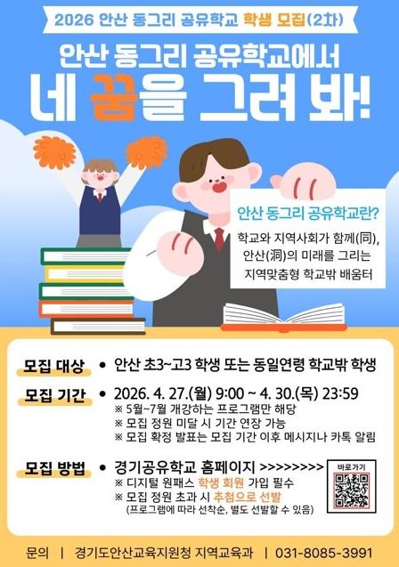 한편 안산교육지원청은 오는 30일까지 나흘간 약 50개 과정, 900여 명 규모의 ‘안산 동그리 공유학교’ 2차 참여 학생을 모집한다. 참여를 희망하는 경우 경기공유학교 누리집에서 신청할 수 있다.