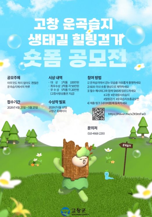 참여 방법은 고창 운곡습지에서 걷는 모습을 자유롭게 촬영해 60초 이내의 숏폼 영상으로 제작한 뒤, 필수 해시태그(#고창 #봄날의운곡습지 #아무것도하지않아도괜찮아 등)와 함께 개인 SNS에 업로드하고 네이버 폼을 통해 해당 링크를 제출하면 된다.