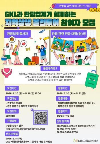 이를 바탕으로 2026년에는 ▲GKL과 함께하는 행복여행 ▲GKL 지역상생 볼런투어 ▲우리동네 문화탐방사업 등 다양한 협력사업을 고령 에서 추진하고 있다.