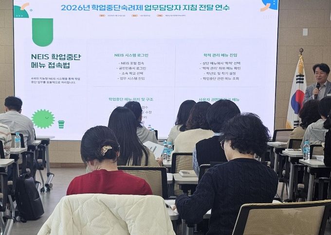 이번 연수는 학업중단 위기에 처한 학생들을 효과적으로 지원하기 위해 마련됐으며, 학업중단숙려제 운영 지침을 공유하고 담당자들의 실무 역량을 강화를 목표로 했다. 학업중단예방사업 담당자가 연수를 진행하며, 제도 운영 방향과 현장에서의 적용 사례를 중심으로 안내했다.