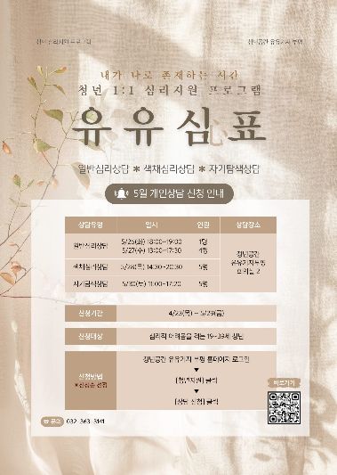 (포탈뉴스통신) 부평구 청년공간 유유기지 부평은 청년 심리지원 프로그램 ‘유유심(心)표’ 5월 참여자를 모집한다.