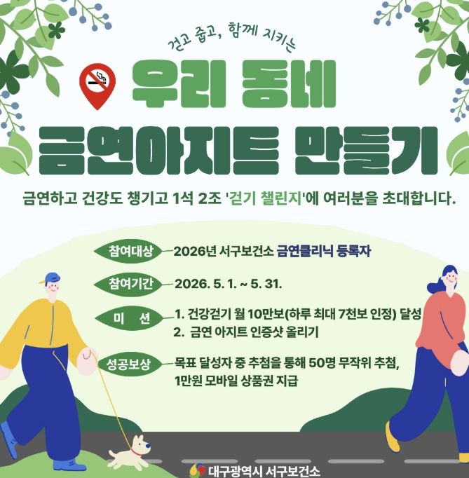 참여 대상은 2026년 서구보건소 금연 클리닉 등록자로 두 가지 핵심 임무를 수행하게 된다. ▲월 누적 10만 보를 걷는 ‘건강 걷기’와 ▲우리 동네 담배꽁초 줍기(플로깅) 또는 금연 구역 안내판 인증 사진을 게시하는 ‘금연 아지트 인증’을 모두 완료하면 된다. 보건소는 매달 임무 완료자 중 50명을 추첨해 1만 원 상당의 모바일 상품권을 증정할 계획이다.