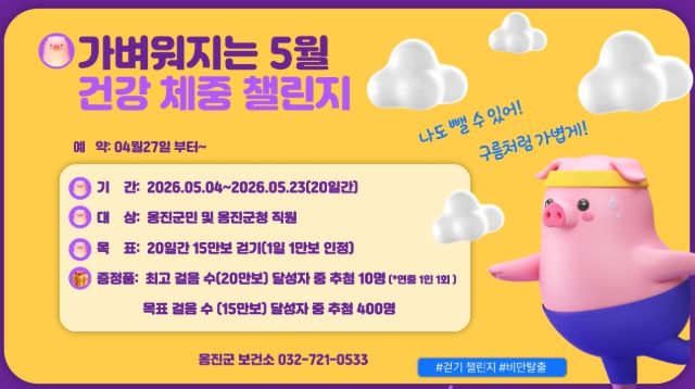 (포탈뉴스통신) 옹진군은 군민의 일상 속 걷기 실천을 유도하고 비만 예방 및 건강체중 관리를 지원하기 위해 5월 4일부터 23일까지 20일간 '가벼워지는 5월, 건강체중'챌린지 참가자를 4월 27일부터 모집한다고 밝혔다.