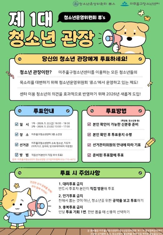 투표는 미추홀구청소년센터 3층 소강당에서 직접 투표 방식으로 이뤄지며, 1차 투표는 5월 22일 16:00~19:30, 2차 투표는 5월 23일 13:00~17:00에 각각 실시된다.