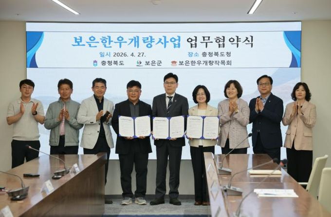 (포탈뉴스통신) 충북 보은군은 27일 충북도청 여는마당에서 충청북도, 보은한우개량작목회와 함께 한우 개량 고도화와 우량 유전자원 확산을 위한 업무협약을 체결하고 보은한우 경쟁력 강화를 위한 추진 기반을 마련했다.
