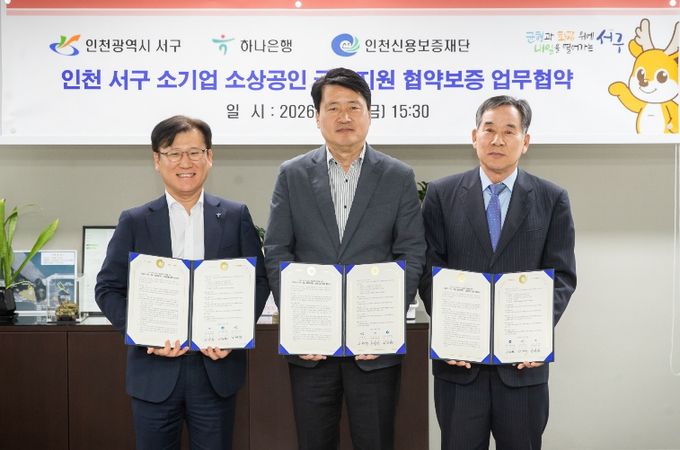 (포탈뉴스통신) 인천 서구는 지난 24일 하나은행, 인천신용보증재단과 함께 15억원 규모의 '서구·하나은행 특별지원 협약보증' 및 '인천서구 특례보증업무협약'을 체결했다고 밝혔다.