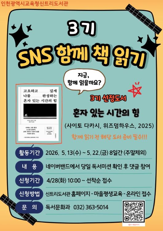 (포탈뉴스통신) 인천광역시교육청신트리도서관은 시민의 일상 속 독서 참여를 확대하고 온라인 기반 독서 문화를 활성화하기 위해, 4월 28일부터 ‘SNS 함께 책 읽기’ 3기 참여자를 모집한다.