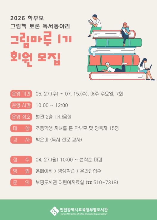 (포탈뉴스통신) 인천광역시교육청부평도서관은 학부모의 독서 역량을 강화하고 자녀와의 소통을 돕기 위해 2026년 상반기 학부모 독서동아리 ‘그림마루 1기’ 참여자를 모집한다.