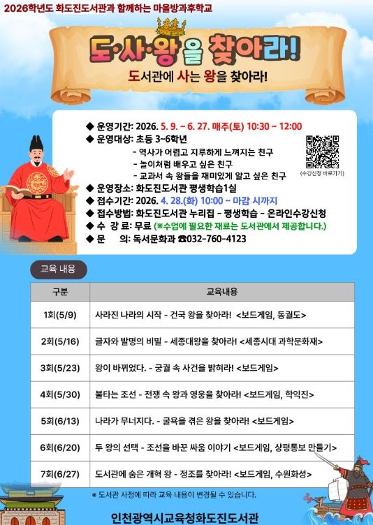 (포탈뉴스통신) 인천광역시교육청화도진도서관은 5월 9일부터 6월 27일까지 매주 토요일, 초등 3~6학년을 대상으로 역사 프로그램‘도서관에서 사는 왕을 찾아라!’를 운영한다.