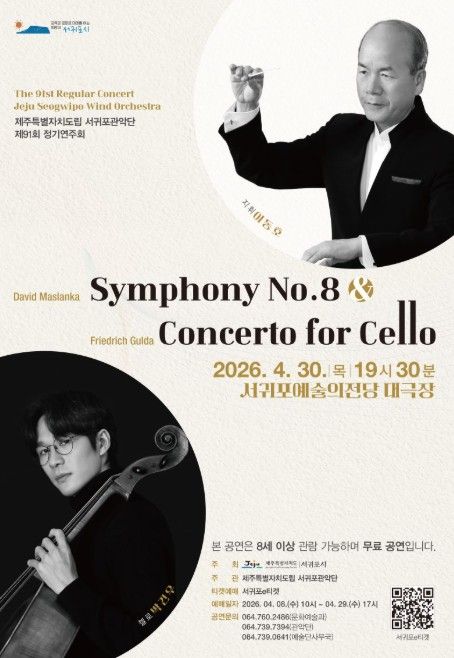 (포탈뉴스통신) 서귀포시는 4월 30일 19시 30분 서귀포예술의전당 대극장에서 ‘제주특별자치도립 서귀포관악단 제91회 정기연주회’를 개최한다.