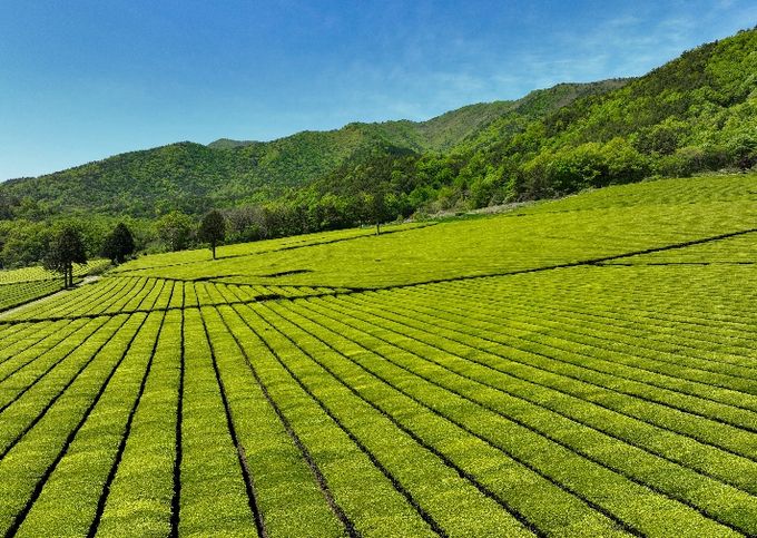 드넓게 펼쳐진 연두색 차밭이 짙푸른 산세와 조화를 이루며 마치 한 폭의 수채화를 그려낸 듯한 장관을 연출하고 있다.