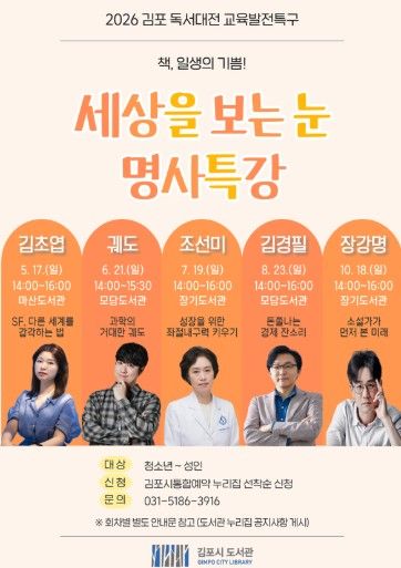 (포탈뉴스통신) 김포시 도서관은 2026 김포 독서대전 교육발전특구 사업으로 '세상을 보는 눈, 명사특강'을 오는 5월 17일부터 10월 18일까지 5회에 걸쳐 관내 도서관 3곳에서 진행한다.